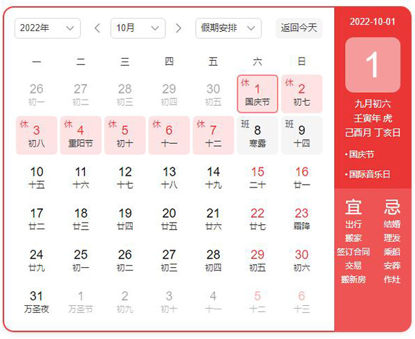 2022年10月1日至7日放假調(diào)休,共7天。10月8日(星期六)、10月9日(星期日)正常上班。需要提前安排發(fā)貨、訂貨的新老客戶需提前與我司相關(guān)工作人員做好溝通,節(jié)假日期間我司只接單不發(fā)貨。